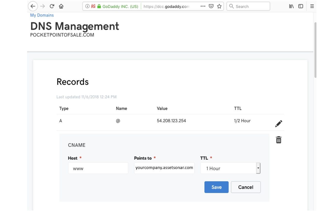 6. In the ‘Points To’ section, enter your WebStore URL (for example, yourcompanyname.assetsonar.com)