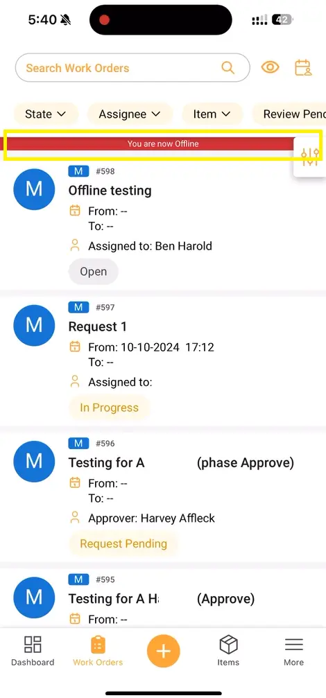 When you’re using the app offline, you can go to the Work Orders tab, open any WO, and add a work log against it.