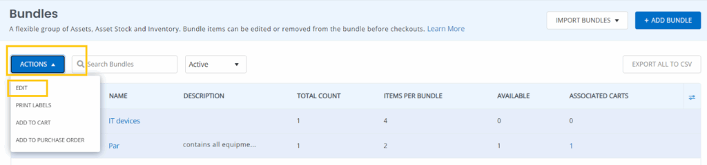 Bundles are used to combine different items that are regularly checked out together. For example, if (any) 2 DSLR cameras, 2 tripods and 3 lens cleaning solutions need to be assigned on a โbeach photoshootโ engagement, then having this as a bundle will serve both as a checklist and a quick one-step process for their checkout. You need to have a cart enabled to use bundles. Enable Cart from Settings โ Add Ons โ Cart Module.