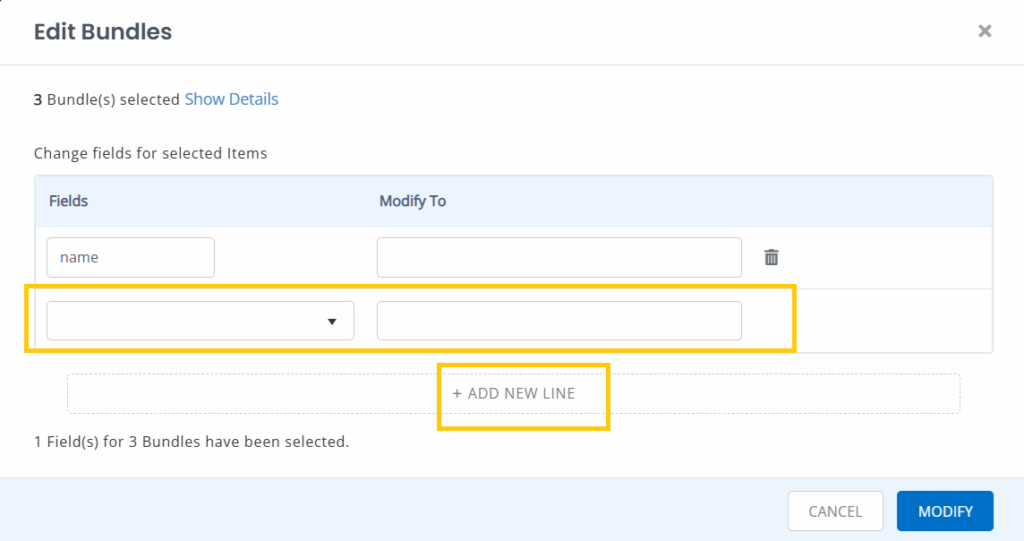 From the Fields dropdown select the relevant field you wish to edit and enter the new information the Modify To field. Once you have selected a field to update, you may add other fields too by clicking on the Add New Line. This will allow you to select and edit other fields for the selected bundles at the same time.