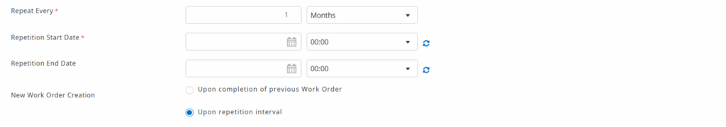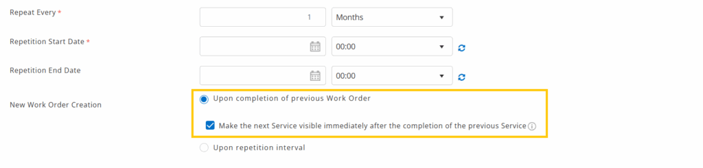 Note: If you select Upon completion of previous Work Order in the repetition criteria, you may also select Make the next service visible immediately after the completion of the previous service. This will make the upcoming service details appear as soon as the previous service ends.