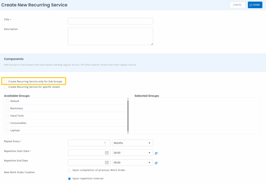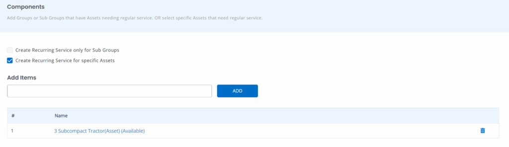 Note: These two options are mutually exclusive. Selecting one disables the other.All recurring services—whether for groups/subgroups OR specific assets—appear together in the Recurring Services Listing.