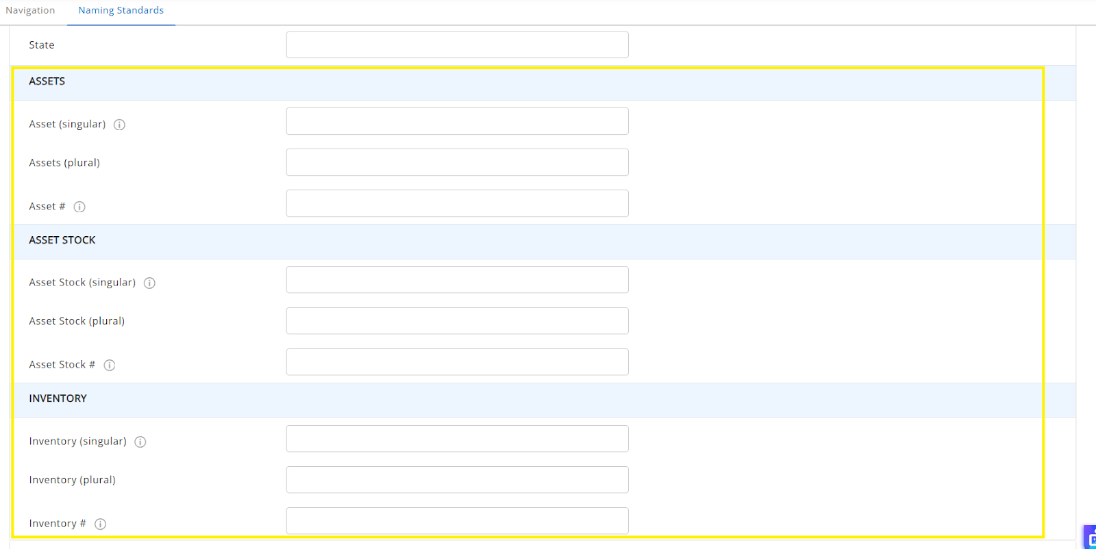 On the Naming Standards tab, you can enter customized names for Asset, Asset Stock, and Inventory as shown below.