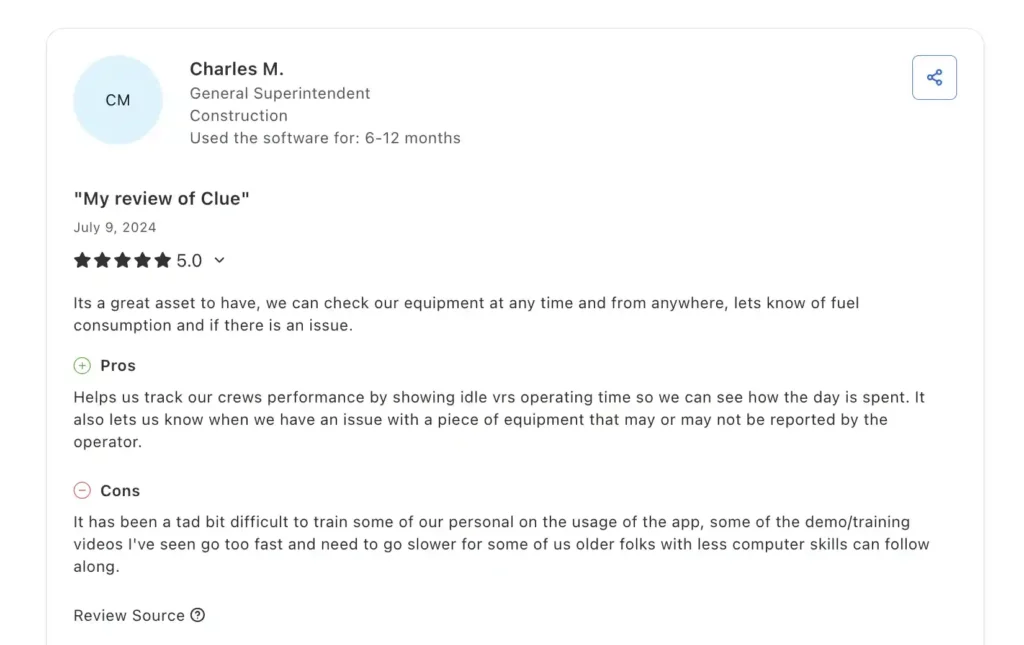 Opt for Clue if: You need deep fleet visibility powered by telematics that includes tracking not just where equipment is, but how itโs performing while optimizing utilization, maintenance, and cost efficiency across large or mixed construction fleets.