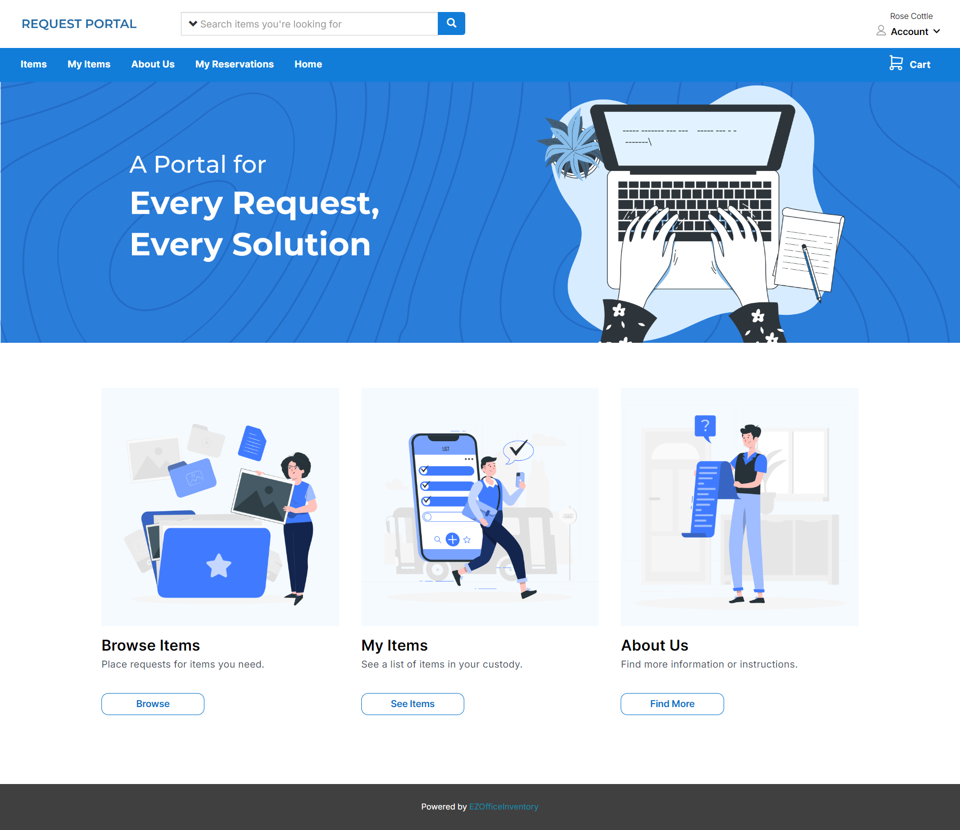The Request Management portal is a self-serve site separate from your EZO account. It acts as a central platform to cater requests coming in from employees. Here staff can search, reserve and request for items they need in a simple, stripped-down, online store-like environment. All these requests are then populated for approval in the Fulfilment center within the app. On the portal users can: