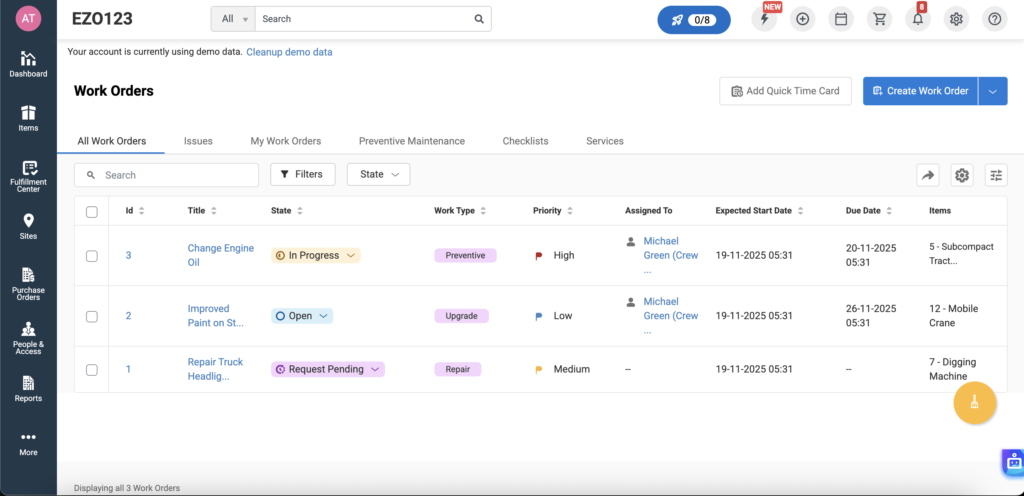 EZO CMMS: Enable the EZO CMMS Add-on to get advanced work order management, preventive maintenance and automated workflows. Sign up for trial and select construction industries to have it enabled for your account. View this video to watch how: https://app.storylane.io/share/zpvnd42xafzg