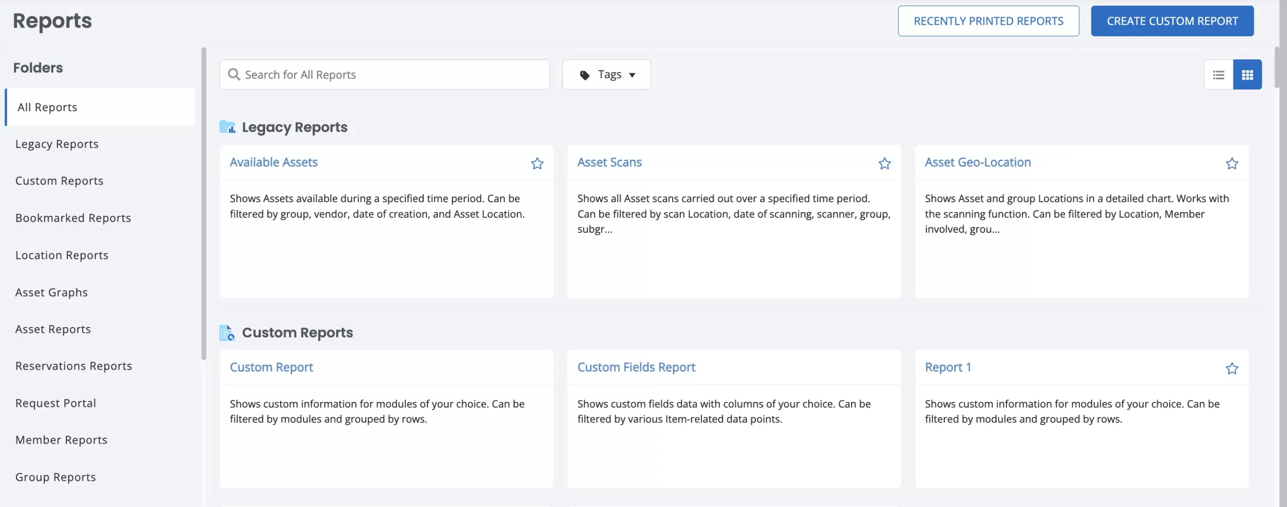 - Access legacy reports for standard metrics like asset utilization, maintenance, and inventory status.
