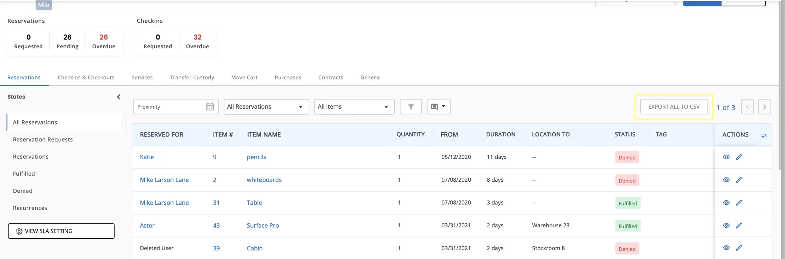 The โActionsโ column enables you to to Edit or View the Reservation, and Approve or Deny a Reservation Request. By clicking on the icons in the Actions column, you can choose the action you need to take.