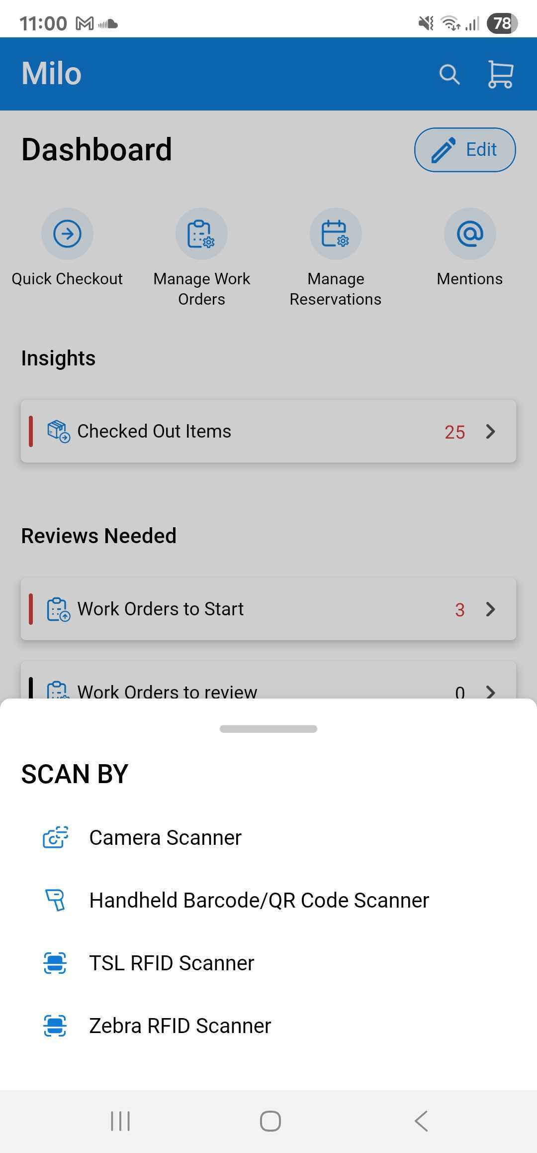 You can now take different actions on your scanned items. Clicking the ‘+’ icon allows you to check the items in and out, verify possession, make reservations, create service records, and more: