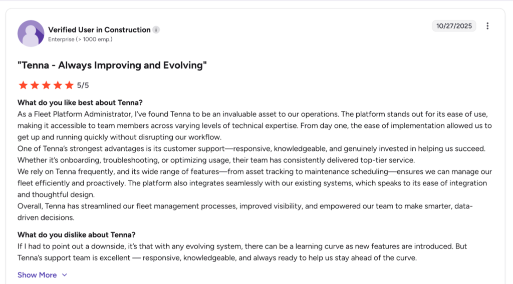 Tenna is capable of handling large, distributed fleets across multiple sites, making it suitable for midโsize to large contractors with complex asset ecosystems.
