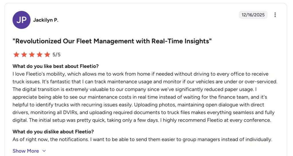 | Enterprise scalability | Designed to handle large fleets, multiple locations, and complex workflows. | Supports growth and ensures the system remains effective as operations expand. |