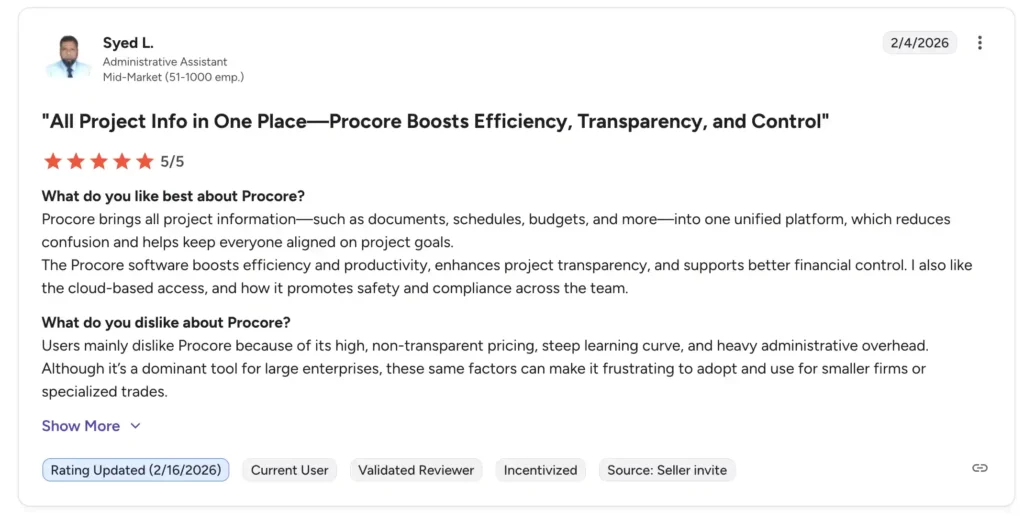 - High cost for smaller teams: Licensing and implementation costs can be significant, especially for small contractors or teams with simpler projects. This can make Procore less accessible for small-scale operations.