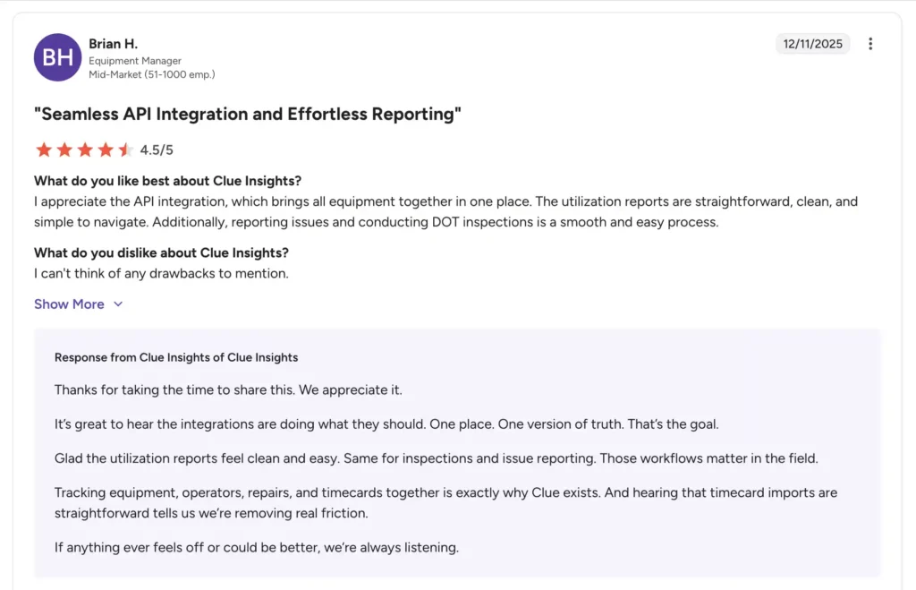 - Strong real-time visibility and analytics: Clue provides live insights into equipment location, utilization, fuel usage, and performance. Managers can quickly identify inefficiencies like idle assets or underutilization.