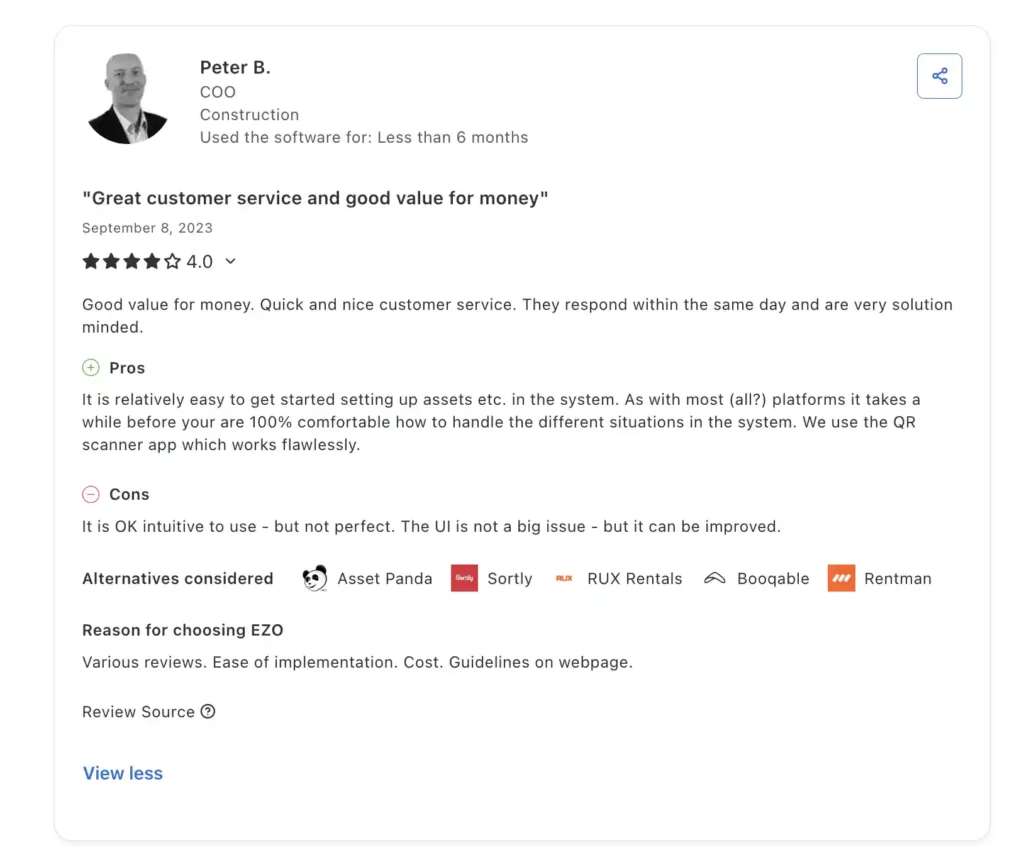 - Construction-based workflows: The construction industry is highly regulated and sensitive, requiring specialized, optimized workflows for equipment management. This includes whether the tool supports advanced capabilities such as equipment tracking, project management, financial management, usage tracking, and reporting and analytics.