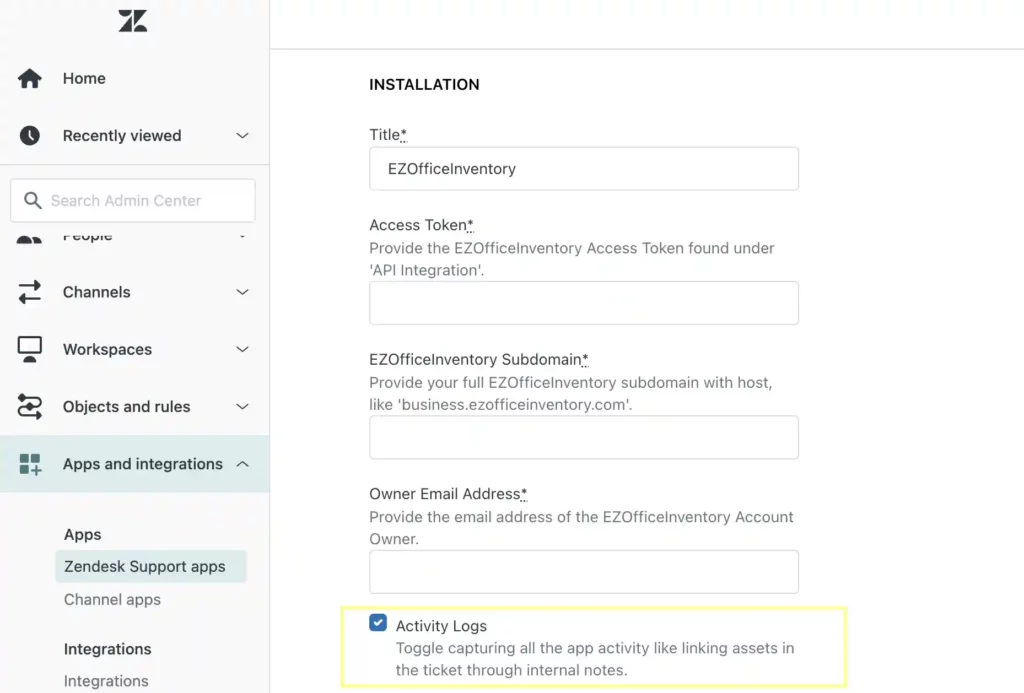 - You will be redirected to the Admin Center page. Click on โApps and Integrationsโ from the sidebar and then select โZendesk Support appsโ from the dropdown. Click on EZO to view settings.