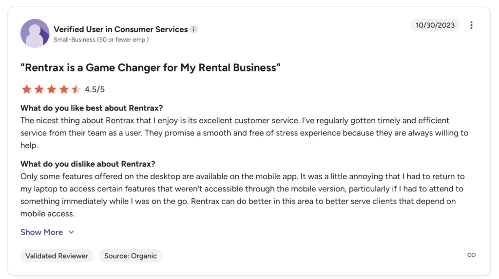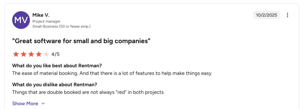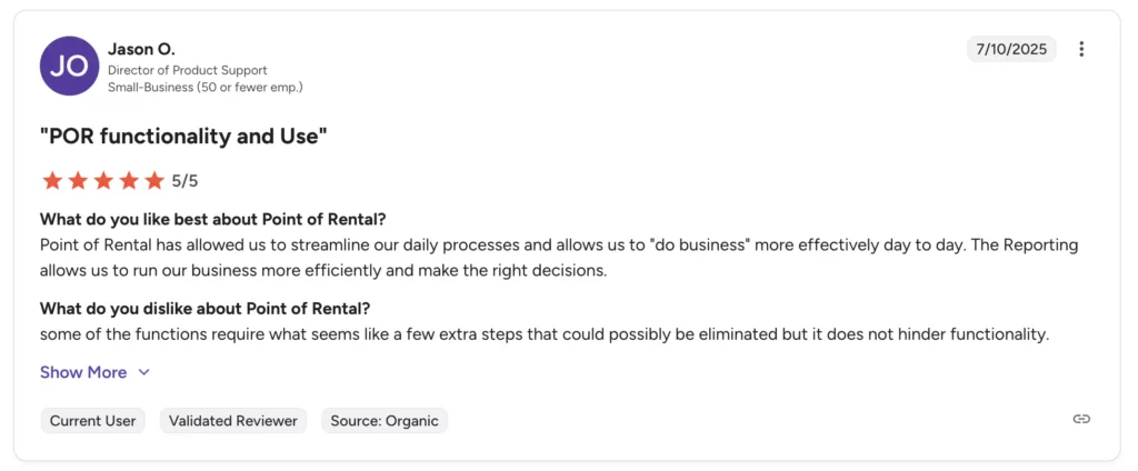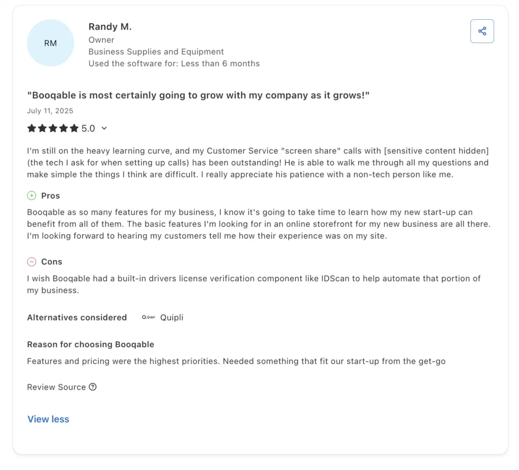 Booqableโs simplicity is great for smaller teams, but reviewers note that it is geared more toward beginners and heavy equipment rental businesses that are not looking to scale extensively. Reviewers have said it may fall short for businesses with complex rental workflows or large fleets.