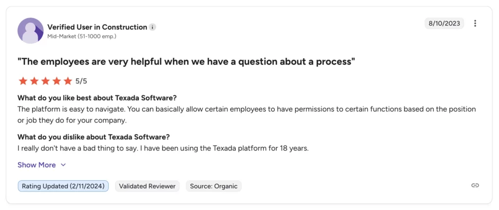 Texada offers limited on-site customization, so users need extensive vendor support for any account adjustments. This can make it harder to adapt the software to specific contract terms, reporting needs, or specialized operational rules.