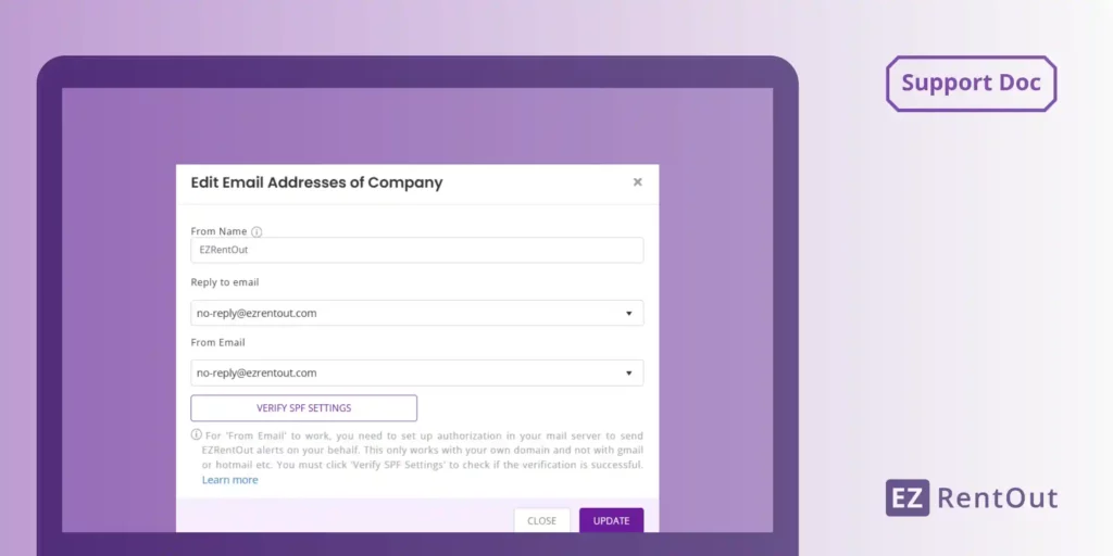 An email has a sender ‘From Email‘ address and a recipient ‘Reply to Email‘ address. You can set both of these addresses as your own email address OR you can only change the ‘Reply To Email’ address while keeping the ‘From Email’ address as no-reply@ezrentout.com.