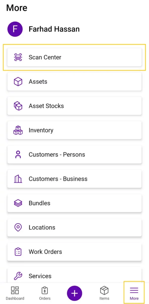 - Open the EZRentOut mobile app (iOS) and go to More โ Scan Center from the bottom navigation bar.