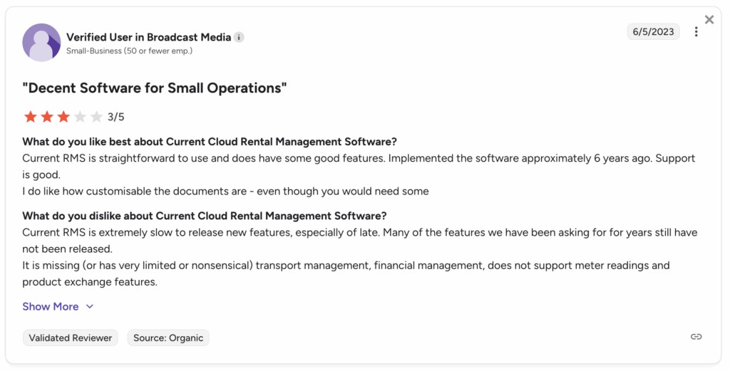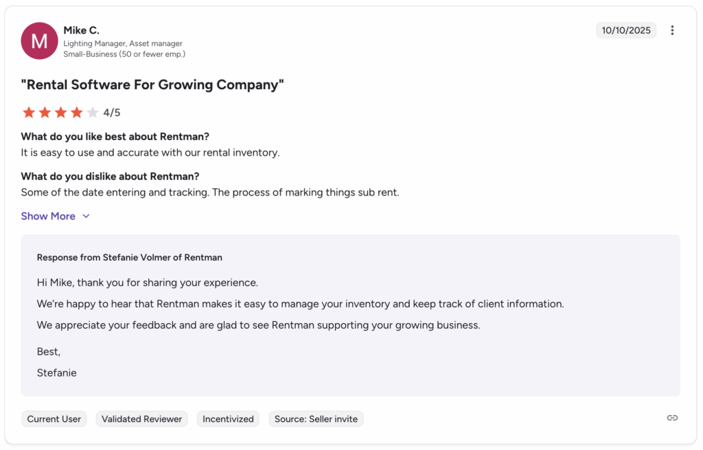 - Industry limitations: Rentman is highly optimized for AV, event production, and project-based rentals. Businesses in heavy construction, industrial equipment, or large-scale general rental may find that Rentman lacks features tailored for high-value, heavy, or long-term asset management.