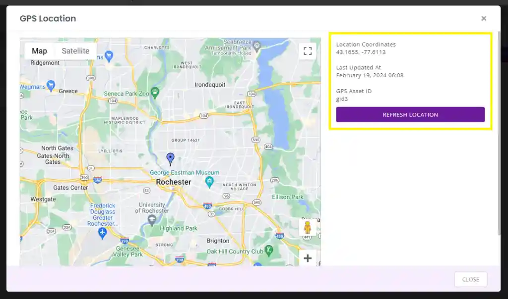 Click on the coordinates in GPS Location, and a popup window will open. It will show you the asset location on the map, the location coordinates, when the last update was, and the GPS Asset ID.