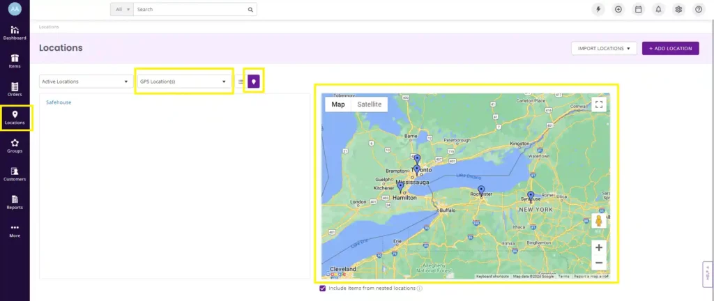To view all your assets on the map, on the side panel, go to Locations โ Click the Pin icon โ Select GPS Location(s) from the dropdown