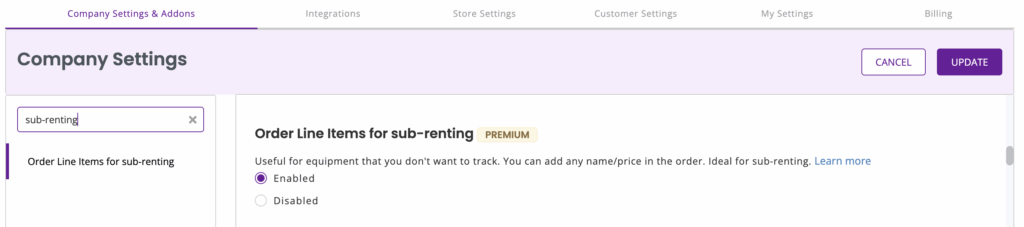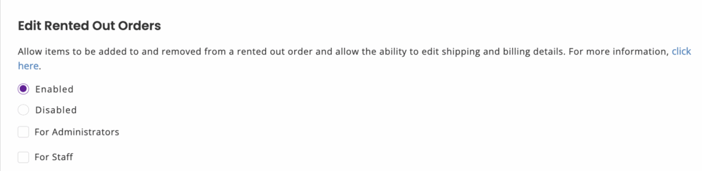 To add a missing item or void an item in a Returned or Completed Order, go to Settings → Company Settings & AddOns → Edit Rented Out Orders and enable it. Choose who is allowed to do this to your Returned and/or Completed Orders; Administrators, Staff, or both.
