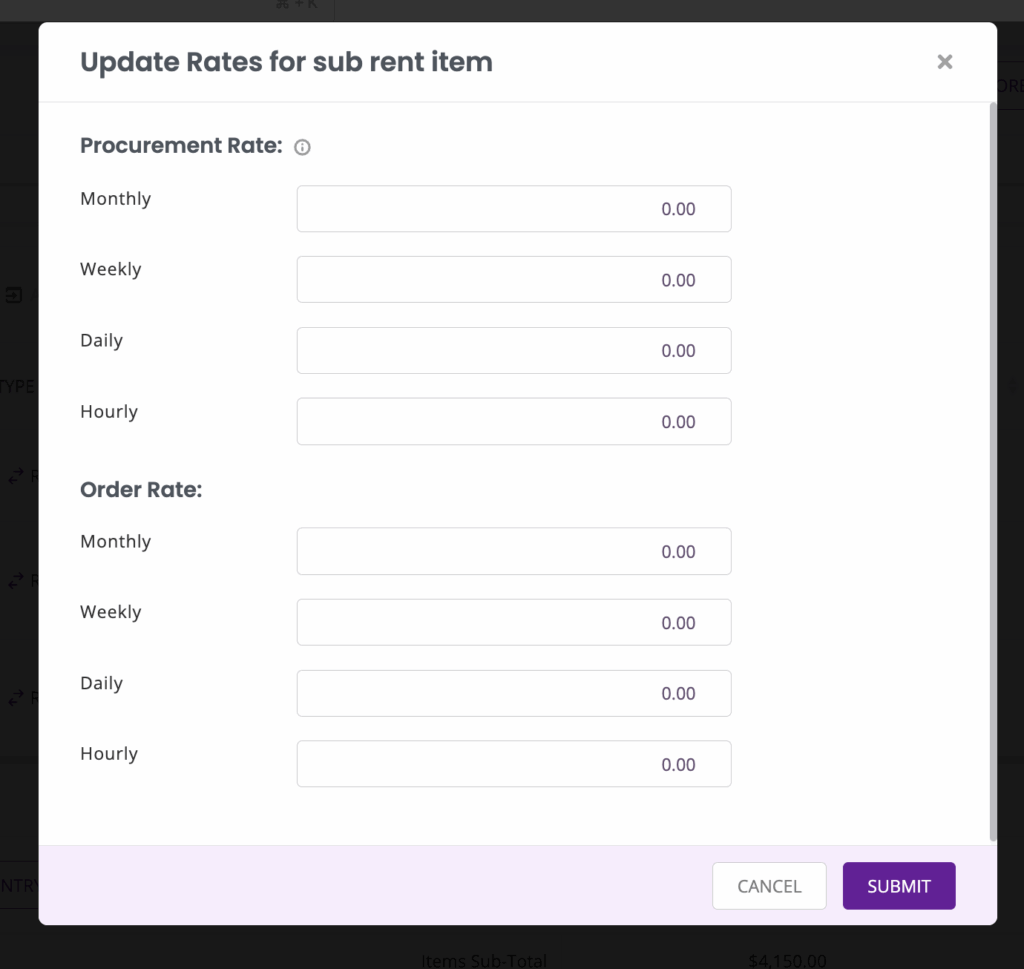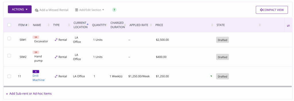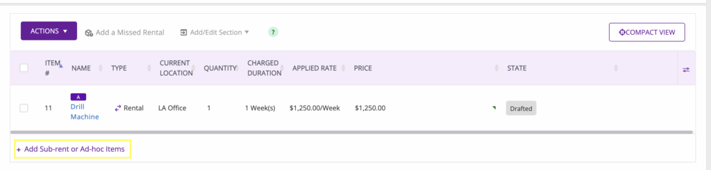 While creating an order, you can choose to sub-rent certain items. To do so, click on “+Add Sub-rent or ad hoc items” to sub-rent an item.