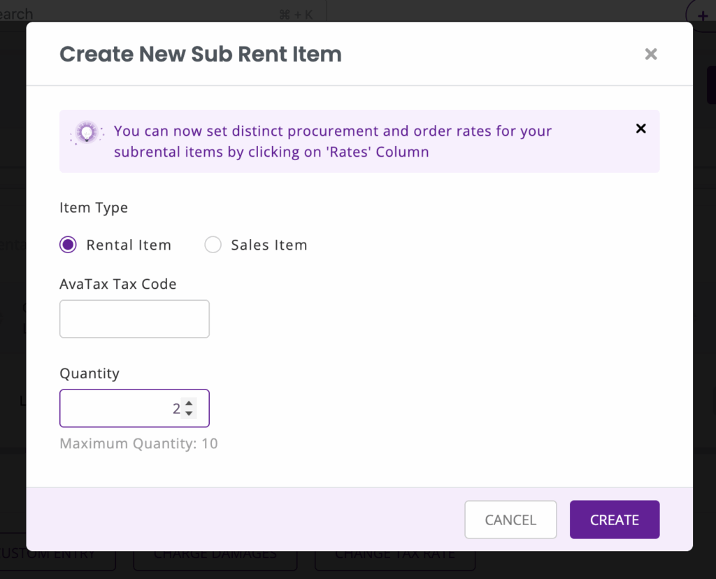 You will be taken to the following window, where you can adjust the quantity of the sub-rented item. Hit “Create.”