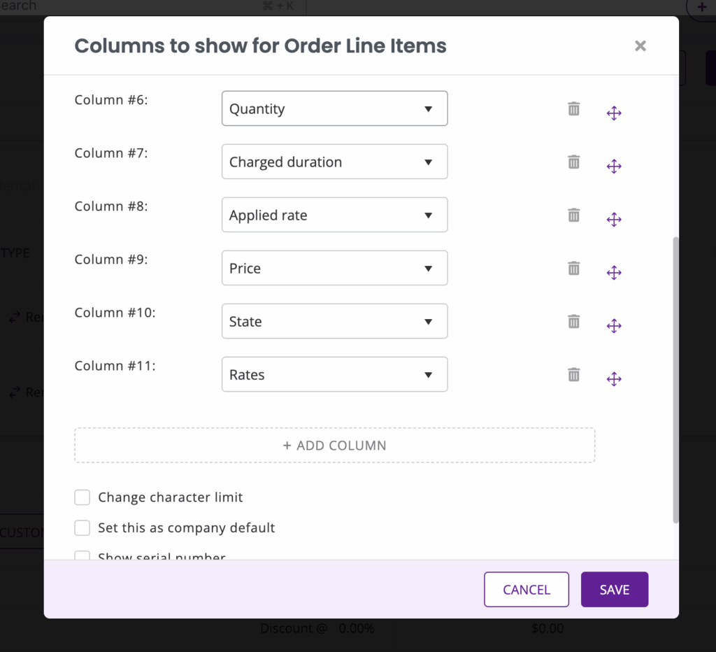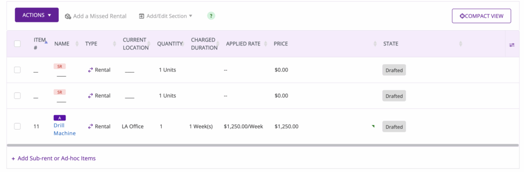 To specify the rental rate for the items, make sure that you have the “Rates” column selected from the columns option.