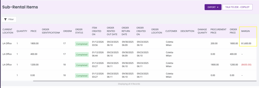 You can also check the amount of profit you are making from the sub-rental by accessing the “Sub-rental Items” Report from the Reports module. It will reflect the margin on the sub-rental as highlighted below.